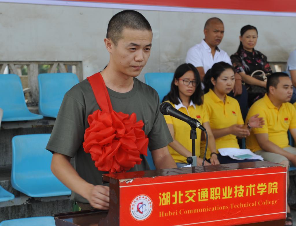 交通信息学院优秀学生王子凝代表全体新兵战友发言,他感谢母校的精心培养,不管走在哪里,都会谨记母校的教诲——脚踏实地、自强不息,为父母争光,为交院添彩,成为一名合格的军人并郑重承诺:一定要为国家的和平与安宁扛好枪、站好岗。