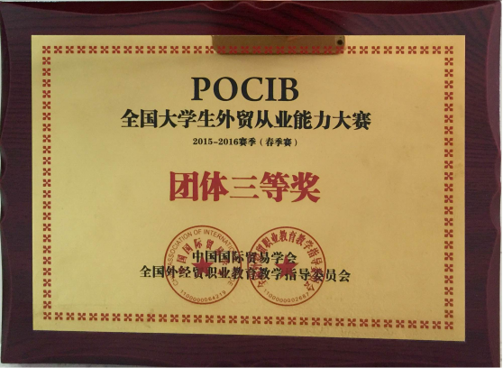 近日,从中国国际贸易学会、全国外经贸职业教育教学指导委员会获悉,我校组织选派的两支商务英语专业学生队伍在2016年全国大学生外贸从业能力大赛(POCIB)中双双夺得团体三等奖。这是我校第一次组织两支队伍参加该项赛事,共40名学生参赛,参赛学生数为历年之最,占到该专业学生总数的62.5%,成绩也为历年最佳。