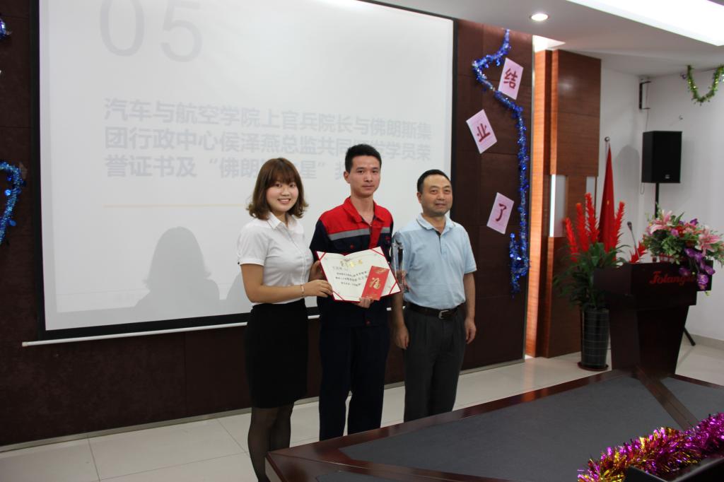 王孝斌一行受到了侯泽宽董事长的热烈欢迎。双方共同参加了我校第二届“佛朗斯精英人才班”结业典礼并听取了同学们的学习成果汇报。佛朗斯集团行政中心总监侯泽燕女士宣读了集团表彰决定,并与汽车与航空学院上官兵院长共同为学员颁发荣誉证书及“佛朗斯之星”奖杯。