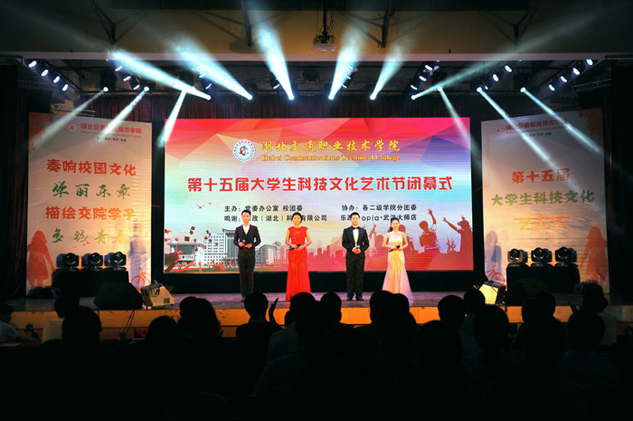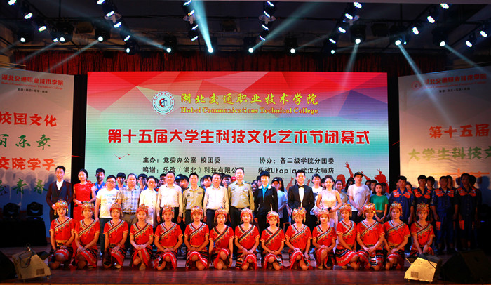 5月26日下午,学校体育馆歌舞飞扬,灯光璀璨,第十五届大学生科技文化艺术节闭幕式在此隆重举行。洪山区委常委、人武部部长李海涛,武警部队文工团政委汪晓光,乐改科技有限公司总经理吴钊应邀出席活动。全体在家领导、各部门负责人与近千名师生员工欢聚一堂,共享科技文化艺术盛宴。