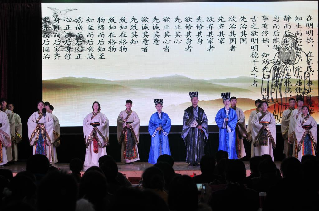来自各二级学院以及北区的11个集体朗诵节目参加了比赛,参赛队伍或吟古诗词,或诵名篇章,时而高亢热情,时而低缓深沉,伴着音乐、舞蹈、武术、舞台剧等表现形式,让诵读呈现出诗、画、歌、舞纷呈和情、景、声、乐交融的优美意境。观众们感受着岳飞“待从头,收拾旧山河,朝天阙”的壮志豪情,聆听着儒家经典篇章诠释的大学之道,欣赏着文人墨客对长江的吟诵和赞美,体会着李白“五花马,千金裘,呼儿将出换美酒”的豪气豁达,更重温了爱国主义和红色经典的大爱与忠魂。整个诵读过程,犹如一曲曲动人心弦的乐章,奏响了中华民族传统文化的和谐旋律,传唱了中华民族千年文字的力量、智慧和魅力。