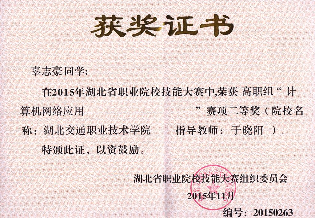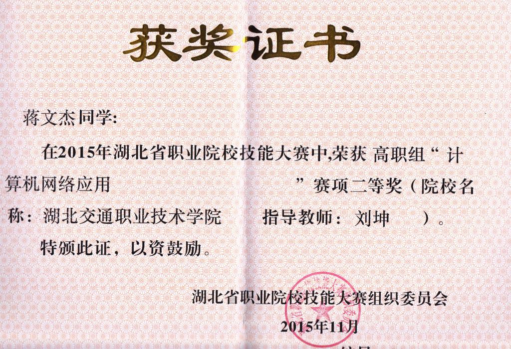 2015年11月22日,湖北省职业院校技能大赛计算机网络应用赛项的比赛在武汉软件工程职业学院举行,我校交通信息学院代表队与省内三十七所院校激烈角逐,由网络技术专业于晓阳老师、刘坤老师、吕翎老师分别指导的辜志豪、蒋文杰、邬卓三位同学组成的团队荣获二等奖。