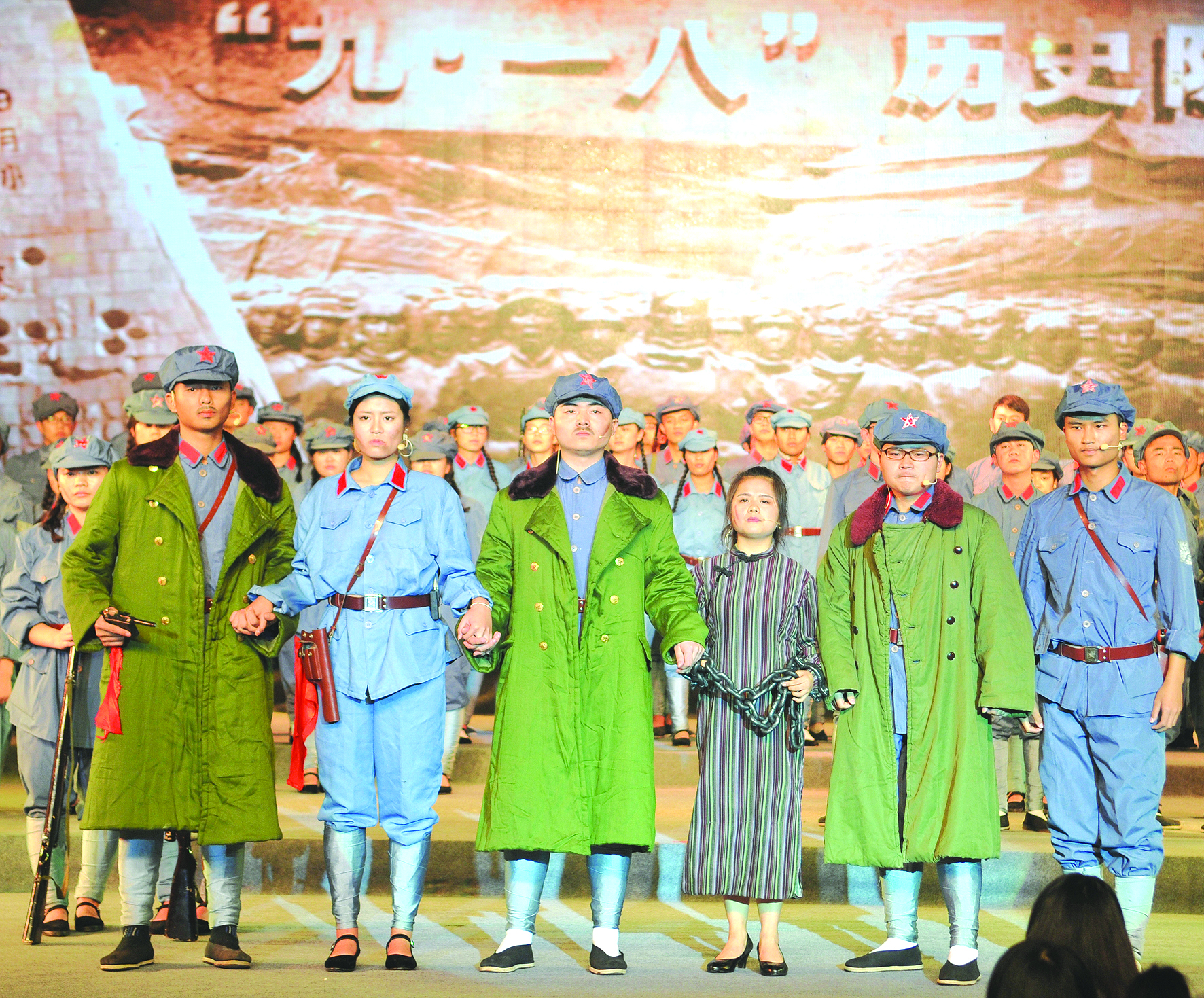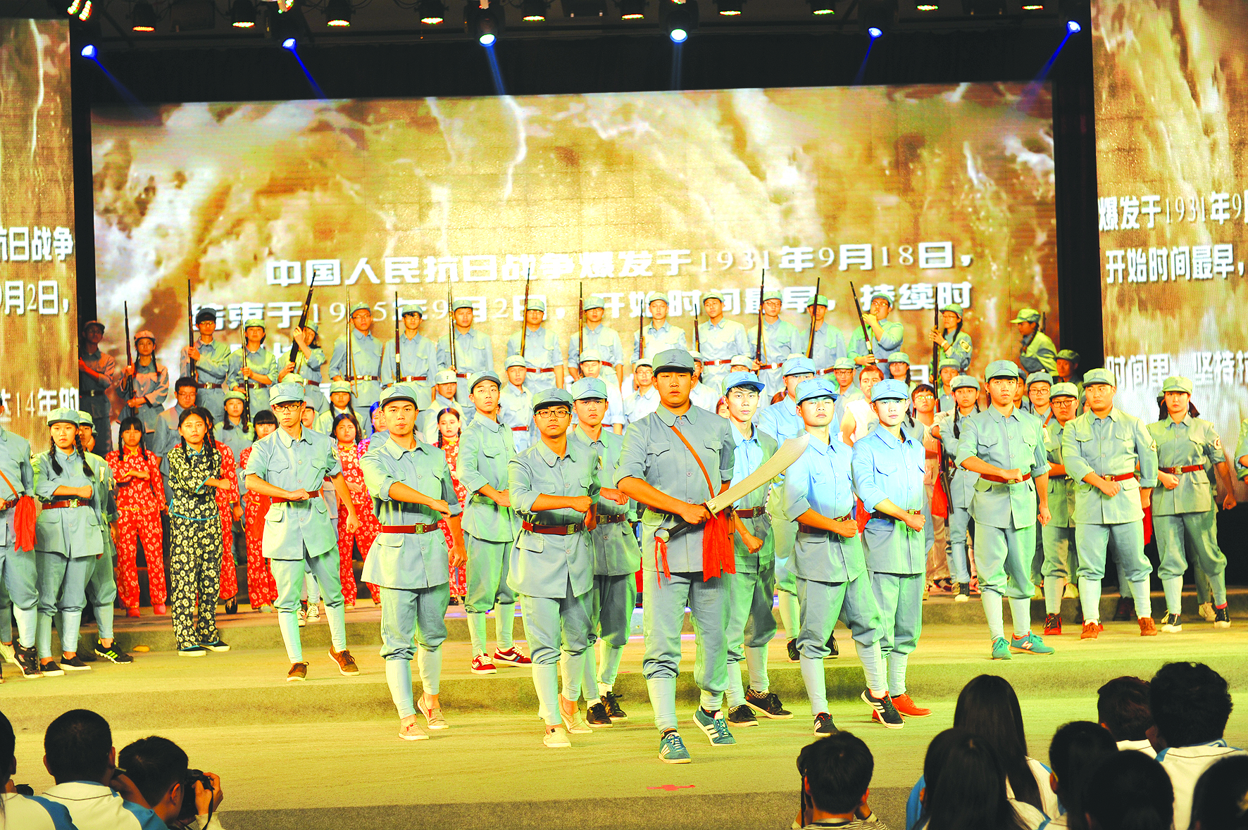 “同学们,这就是日本帝国主义军队侵略中国的土地啊,这段历史你们不能忘啊!”舞台上,炫蓝的灯光与纷飞的雪花交相辉映,老师带领同学们参观抗战博物馆,将大家的思绪带回70年前的抗战岁月。11月5日晚,学校体育馆灯火璀璨,一场形式新颖、内涵丰富、特色鲜明的抗战主题歌舞晚会为第十五届大学生科技文化艺术节拉开大幕。
