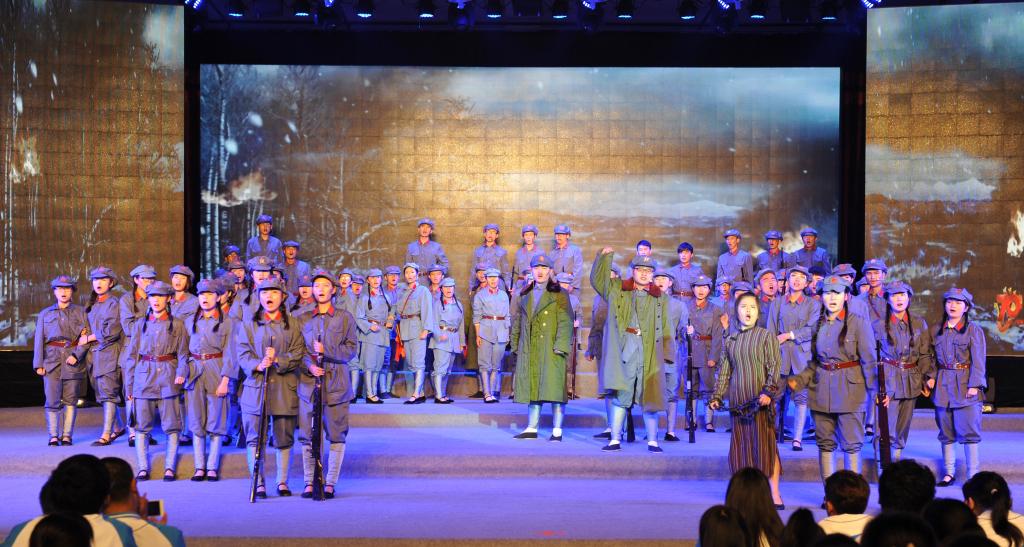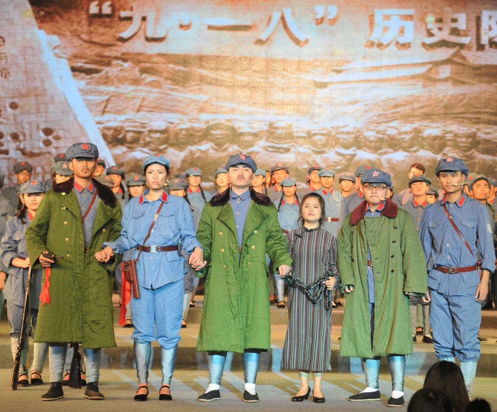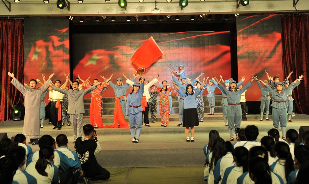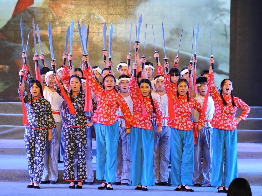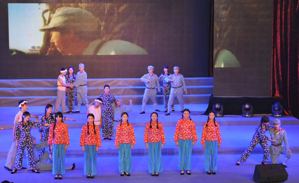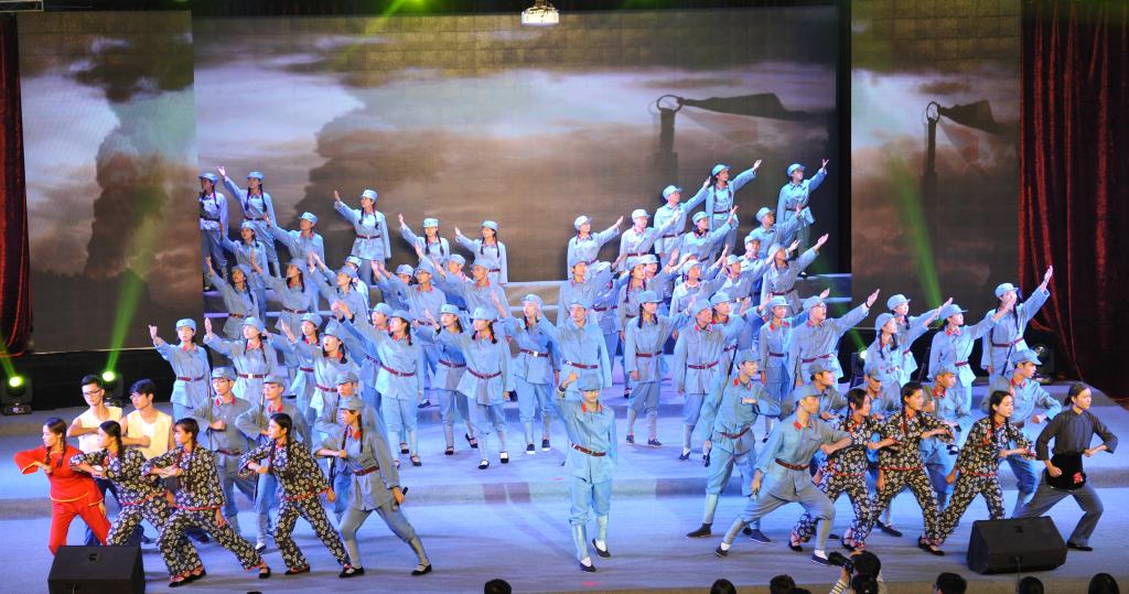 晚会共分为3个篇章,7个片段,以八年抗战为历史主线,用歌舞剧的形式展现了中国人民的“浴血”、“奋战”、“胜利”史。节目开篇“浴血”,由老师带领同学们瞻仰抗战英雄、讲解抗战史实拉开序幕,同学们仿佛从历史博物馆穿越到历史的过去,时间回到1937年7月,是时,日本侵略我国东北,一幕《松花江上》以赵尚志、赵一曼等抗战英雄的人物独白倾吐出东北人民抵抗日军侵略中国的英勇与悲壮,“不做亡国奴!”的齐声呐喊催人泪下,令人动容。改编自陕北民歌的《山丹丹花开红艳艳》歌舞剧,描述了正逢山丹丹花盛开时节,红军抵达陕北时军民欢歌乐舞的情景。中篇“奋战”,《抗日出征歌》通过鬓发染霜、步履蹒跚的老母、新婚的陕北小媳妇、儿时共同成长的小伙伴对解放军们的流泪诉说、嘘寒问暖,表达了军民一家,朴素真挚的情感。《太行山上》唱出了“今番渡得黄河来,要把敌人消灭净”、“红军不怕远征难,万水千山只等闲”的民族血性,展现出人民顽强奋战的坚定信念。《到敌人后方去》、《游击队之歌》轻快流畅的曲风,生动刻画了机智、顽强的游击队群体英雄形象,展现抗战人民于艰苦环境下的乐观主义革命精神。根据电影《闪闪的红星》主题曲《映山红》改编的歌舞以演员们细腻生动的表演,舞出了人民对美好生活的向往和对红军的不舍与思念。《毛主席的话儿记心上》,亲切温暖,娓娓道来。《大刀进行曲》展现了中华民族英勇抗战、不达目的誓不罢休的决心。《保卫黄河》以黄河两岸人民的英勇斗争为题材,采用钢琴伴奏,以明快、豪放、充满力量的大合唱展现了人民为保卫黄河、保卫全中国而战斗的壮丽场景。尾篇《胜利之歌》中,时间回到2015年的今天,老师带领同学们对抗战英雄们致以最崇高的敬意,并高呼胜利、捍卫和平。演员们身着海陆空三军军装,以响亮的战斗口号、铿锵有力的节奏展现抗战胜利,举国欢庆的情形,将晚会推向高潮。