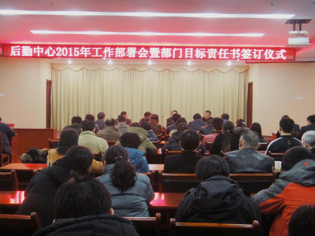 2月27日上午,学院后勤中心召开2015年度工作部署暨目标责任签订会。院领导王树荣及后勤处负责人出席会议,后勤中心全体职工以及项目托管公司华工后勤集团、山东明德物业公司、北山物业公司、生命星光医疗公司等四个单位职工代表百余人参加会议。会议由后勤中心党支部书记江继中主持。