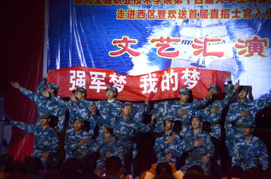 阅兵仪式结束后,文艺汇演在热烈的掌声中拉开了序幕。学院领导发表了热情洋溢的致辞。他说,2012年,学院获得直招士官的资格,首届招收了50名学生,两年半的时间转瞬即逝,同学们完成了自己的学业,即将踏上人生的新征程,今天是一个值得庆祝,并永远记忆和珍藏的日子。院领导对即将离开母校的同学们提出三点期望:一是要坚持理想。实现理想的道路是坎坷的,充满艰辛的,必须付出辛勤的汗水和百折不挠的努力,才能结出累累的硕果。二是要脚踏实地,积极进取。走入军营后,希望同学们尽快完成从学生到军人的转变,严格要求,苦练本领,为中国梦的现实,为中华民族屹立于世界民族之巅提供坚强的力量保证。三是要常怀感恩之心。不管身在何处,无论岁月怎么流逝,都不要忘记父母的养育之恩,老师的教育之情,同学的纯真友谊。