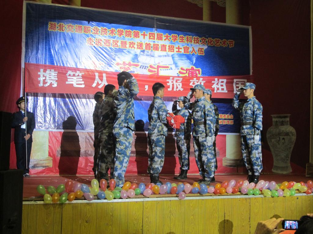 在庄重的敬旗仪式后,文艺汇演正式开始。文艺汇演节目形式多样,有舞蹈、朗诵、小品、军旅歌曲联唱、大合唱等,展示了交院学子朝气蓬勃、奋发向上的精神风貌。在寄语《师生情》节目中,士官班辅导员柏极星老师饱含深情地朗诵了自己为士官一连创作的的诗,真挚而又感人的话语深深地打动了在场的每一位老师和学生,此时一连班长带领全连士官庄重承诺:请老师放心,请学院放心!一句句响亮的话语在多功能厅回响,将现场气氛推到最高潮。最后,各级领导上台为即将进入部队的同学们佩戴了写有“光荣”二字的大红花,预祝他们进入部队后一帆风顺,为校争光,为国家做出贡献。