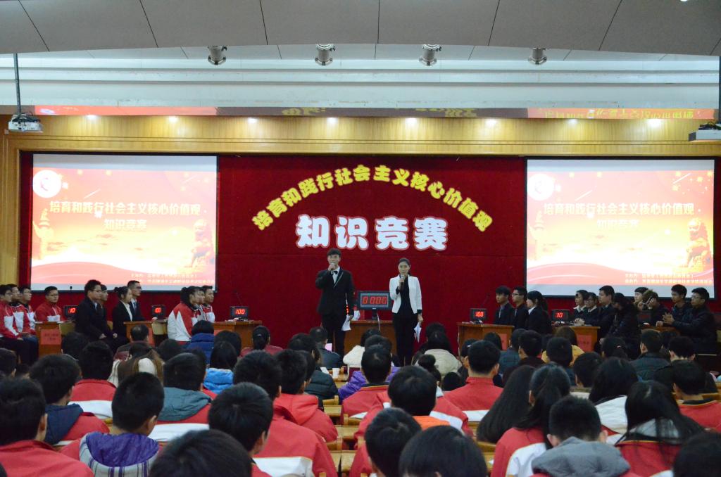 睿智问答启迪生活哲学,妙趣探索点亮人生智慧。12月11日晚6点30分,由我院思政处主办,院团委承办的培育和践行社会主义核心价值观知识竞赛决赛在五楼学术报告厅隆重举行。出席本次活动的嘉宾有副院长王同庆、副院长谢彤以及思政处、院团委、各系分团委负责人。我院各系部共七支学生代表队展开了激烈角逐,机电工程系学生代表队凭借精彩的发挥和团队配合摘得冠军,道桥系和计信系代表队获得二等奖,北区、设计艺术系、管理系和港航系代表队获得三等奖。
