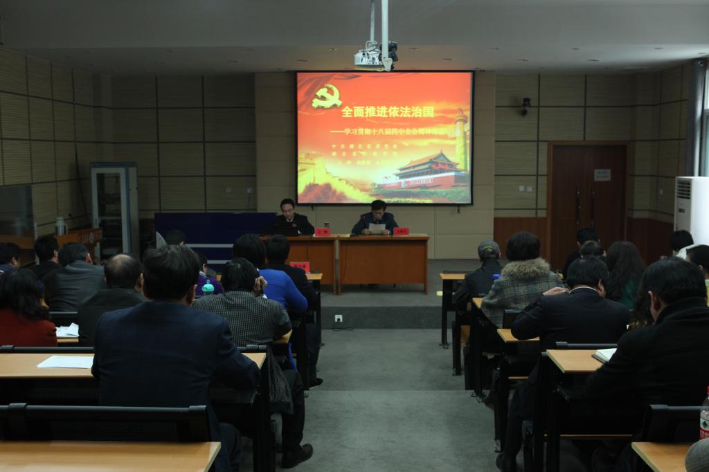 院领导作了总结讲话。他强调,学习贯彻落实十八届四中全会精神,是学院当前和今后一段时期内的一项重要工作。会后,党委办公室还要根据学院党委的统一部署和要求,组织学院各级党组织、广大党员和师生员工,认真学习、宣传、贯彻好全会精神,不断推进学院的改革发展工作。广大党员干部要带头认真学习、深刻领会全会会议的精神实质、准确把握科学内涵,做到联系实际、入脑入心,切实把思想和行动统一到中央的决策部署上来,坚持以法治思维、法治意识、法治观念,推动学院又好又快发展。最后,院领导结合学院工作提出三点要求,一要深刻领会十八届四中全会精神,着力提高对全面推进依法治国重大意义和全面部署的认识,切实把思想和行动统一到中央关于全面推进依法治国重大决策部署上来。各党总支、党支部要按照学院党委的统一部署,组织好下一阶段的学习活动,并将法治教育活动作为一项长期的重要工作坚持不懈地开展下去,让法治精神成为师生共同的思维方式、价值取向和行为规范。二要全面贯彻落实四中全会精神,始终坚持依法办学、依法治校。要进一步高度重视制度的建设,确保在学院各项工作中重规范,讲程序,要进一步完善内部治理结构,推动学院综合改革。三要把学习贯彻全会精神与抓好年内各项工作目标任务结合起来。要进一步加强纪律建设和作风建设,进一步做好“两个责任”的落实,着力营造学院风清气正的教育教学环境。同时,学院各部门要以四中全会精神为指引,全力做好年内各项收尾工作,确保圆满完成年度目标任务。(摄影/江迪 陈浪)