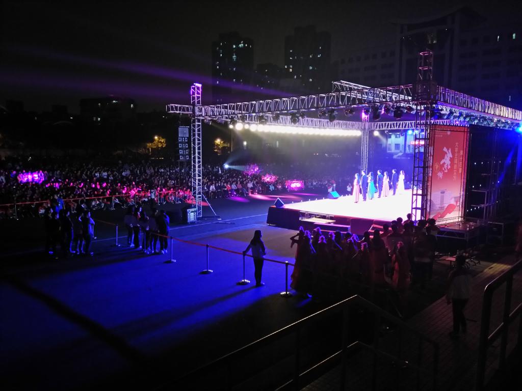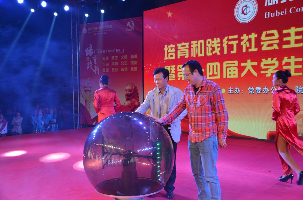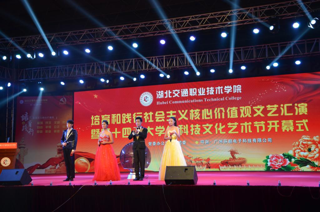 在激昂的音乐中,院领导与广州芬朗公司总经理吴顺启动LED激光仪式球,共同宣布:yl6809永利官网第十四届科技文化艺术节隆重开幕!立时,彩球变幻不同的色彩和形状,台前绚丽的烟花骤然绽放,舞台和天空顿时如星辉璀璨。