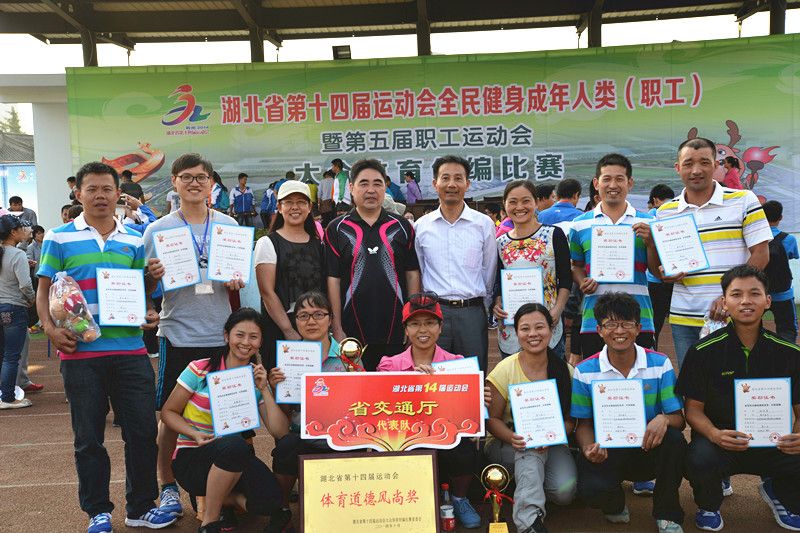 10月9日-10月10日,由湖北省政府主办,湖北省总工会、省体育局和荆州市政府承办的湖北第十四届运动会全民健身成年人类(职工)大众体育创编比赛在荆州理工职业学院举行,我院职工代表湖北省交通厅参加了本次比赛,经过两天的激烈对决,我院参赛队员面对强手如云的压力,鼓足士气,顽强拼搏,取得了企业男子组第六名,女子组第八名的好成绩,同时代表队荣获体育道德风尚奖。