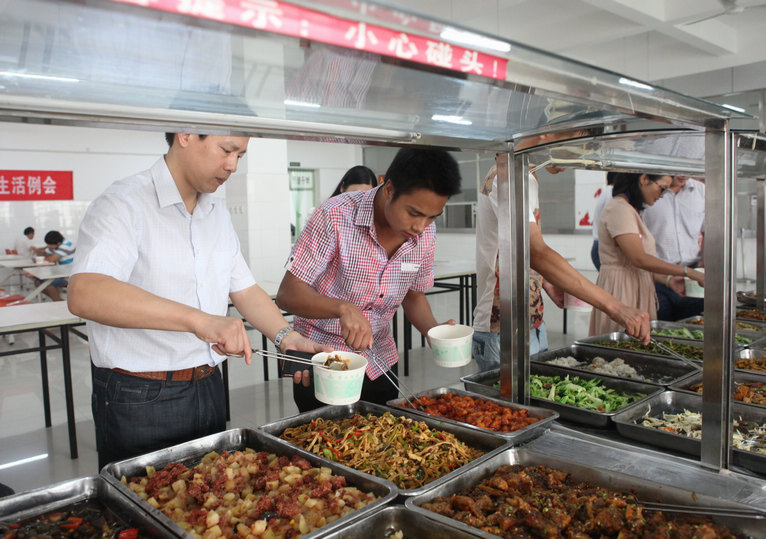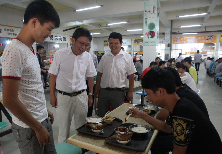 陈院长一行走进正在食堂就餐的新生们中间,询问饭菜是否可口,价格是否合理,同学们对学子餐厅的饭菜、价格都表示满意。来到学生伙食监督岗,学院领导查看了伙食监督记录本,询问值班工作人员记录本上的意见是否得到及时处理,得到满意答复后,院领导提出这项制度要坚持下去,学生伙食无小事。院领导强调指出,后勤部门要以学生为本,加强管理,提高质量,多了解情况,及时掌握学生对饭菜质量、饮食卫生、服务态度等方面的意见。