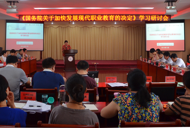 7月11日,湖北交职院举行专题学习会,学习贯彻《国务院关于加快发展现代职业教育的决定》(以下简称《决定》)精神,提高思想认识,认清发展形势,理顺办学思路,进一步推动学院品牌建设和又好又快发展,继续办好社会满意、人民满意的高等职业教育。全体在家院领导,各部门负责人,党总支书记、副书记及直属党支部书记参加会议。会议由院长陈方晔主持。