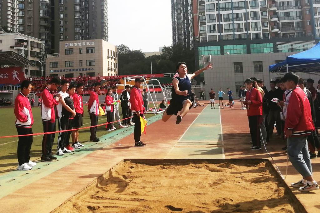10月31日上午,我校运动会如期开幕。9时30分,男子跳远比赛开始,所有运动员纵身一跃,完美展现自己。其中公轨学子董建辉连连飞跃,跳出6米5的好成绩,勇夺学生男子跳远冠军。