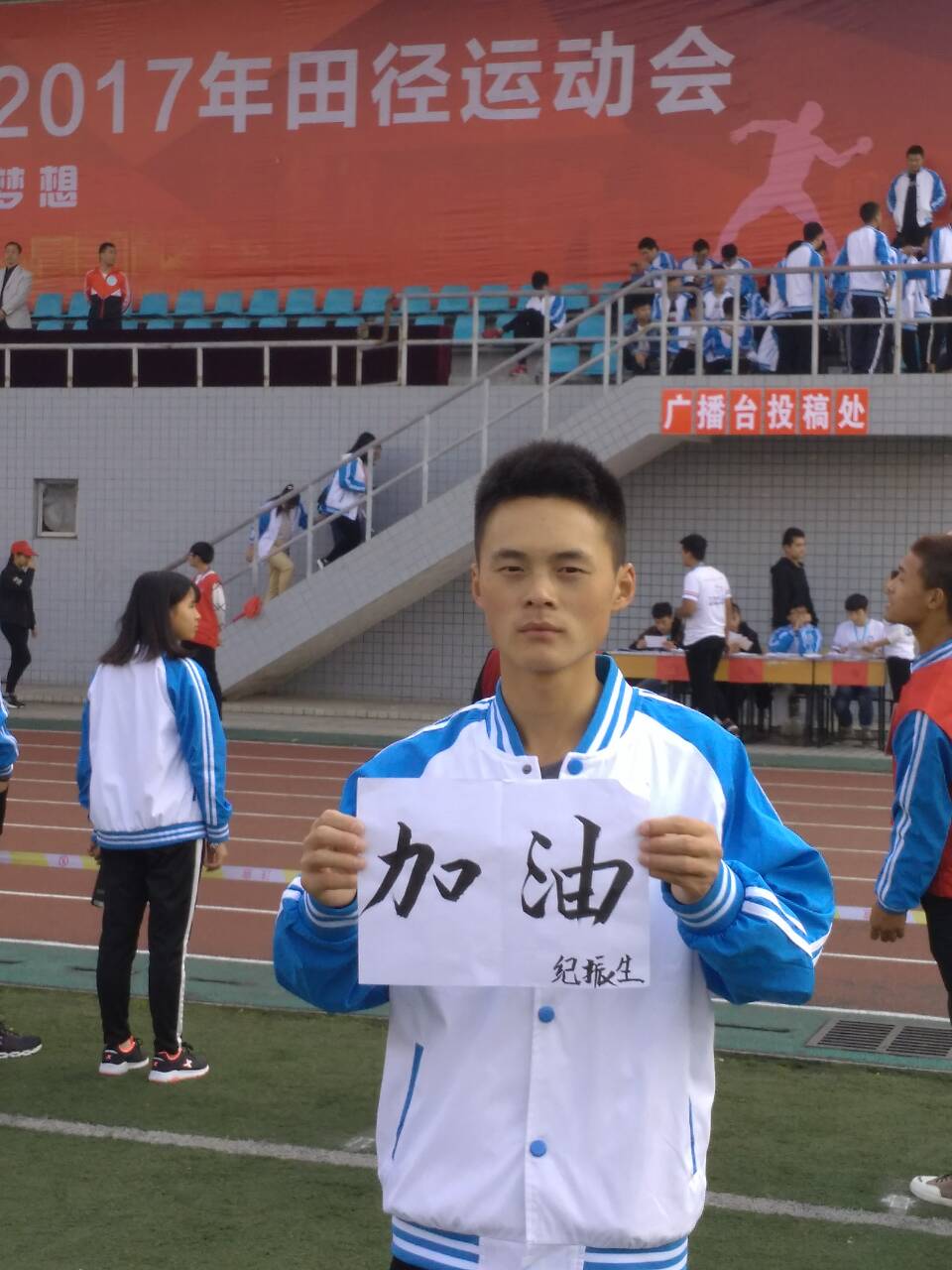 据了解,纪振生退伍于边藏防卫部队,本应2017年9月退伍入学,但因紧急执勤指令而退伍时间推迟。10月退伍入学时,学校运动会报名已经结束,于是他以跟跑的形式参加运动会。