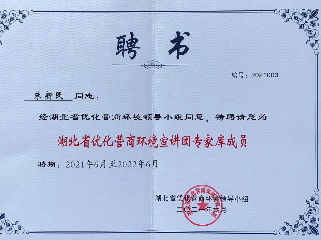 近日,湖北省优化营商环境领导小组向我校发来聘书,聘请我校朱新民教授为湖北省优化营商环境宣讲团专家库成员。经学校推荐,省交通运输厅审核报送,省营商办专题会议严格筛选、省优化营商环境领导小组审定同意,朱新民成为全省交通运输系统唯一专家入选湖北省优化营商环境宣讲团专家库成员。