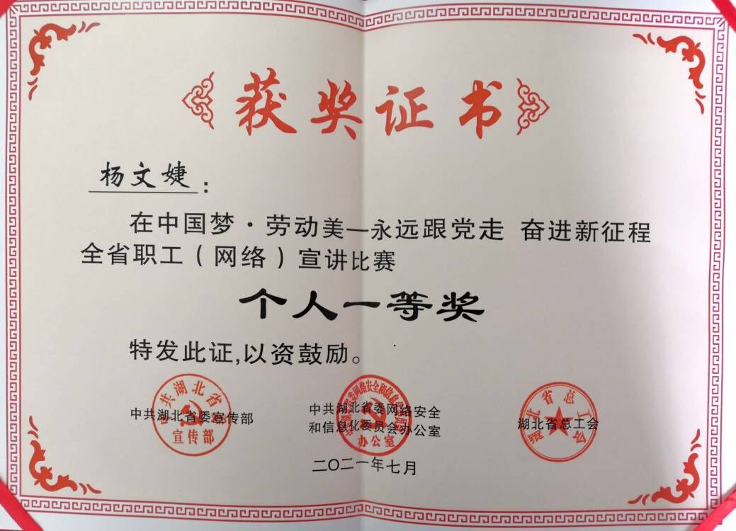 “2021年5月28日零时,这是湖北交通史上永远铭记的时刻……”6月29日上午9时,由湖北省委宣传部、湖北省委网信办、湖北省总工会联合主办的“中国梦·劳动美——永远跟党走 奋进新征程”全省职工(网络)宣讲比赛在“云端”正式开赛,350多万人通过《工人日报》app、湖北发布、长江云、《湖北新闻》头条号等平台同步观看了比赛。我校教师杨文婕的主题演讲《百年梦想 衢通九州》经过激烈角逐,荣获一等奖。