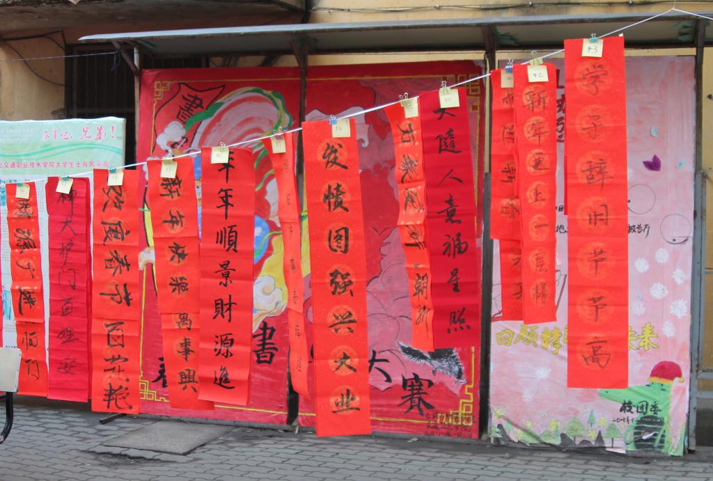 经过两周的收集与筛选,共有70余幅春联作品参加此次比赛,并于1月10、11日分别在我校宣传长廊、信息大楼前小树林进行作品展示。活动吸引了我校领导、老师、学生的高度关注,他们纷纷驻足观看。有同样爱好书法的同学在现场挥毫泼墨,并将相关作品带回寝室,给寝室添新装,更多同学则参与到了现场投票环节,为自己喜欢的作品进行投票。