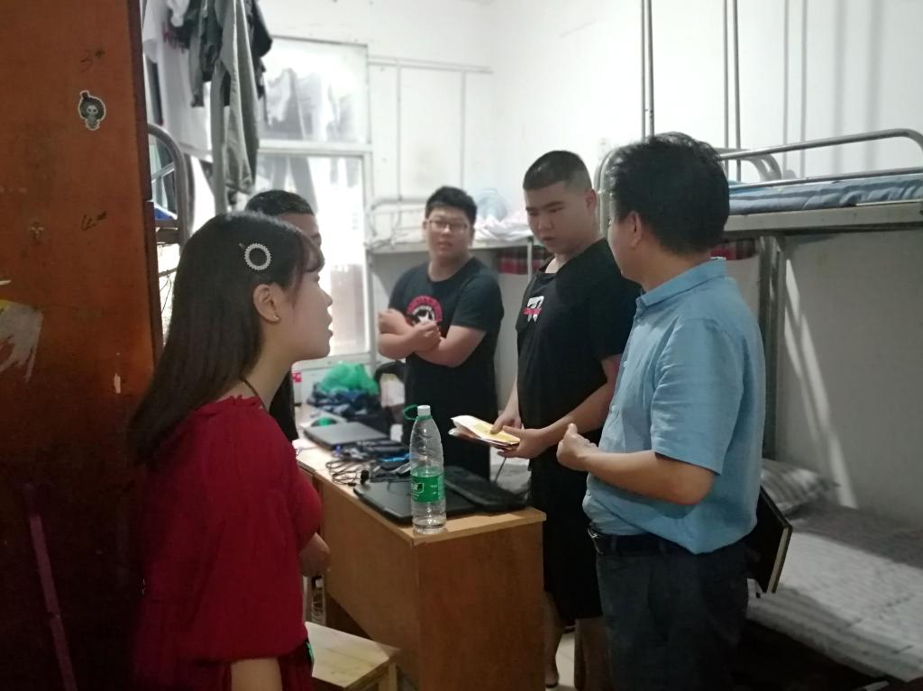 李建明一行逐一走访了路南、路北共121间新生宿舍,每到一处都会亲切询问新生的专业班级、家乡、报到进展还有宿舍成员等情况,重点检查了新生住宿环境和寝室安全隐患。“能否适应新学校的生活?”“对学校的迎新工作是否满意?”学院领导亲切的话语让新同学们倍感安心,也都纷纷加入谈话。马进对新生提出期望,“希望大家新学期不要懈怠,继续努力,尽快适应大学生活,认真对待学习,不辜负大学的美好时光。有任何困难和问题及时反映,学院一定会尽全力给予解决。