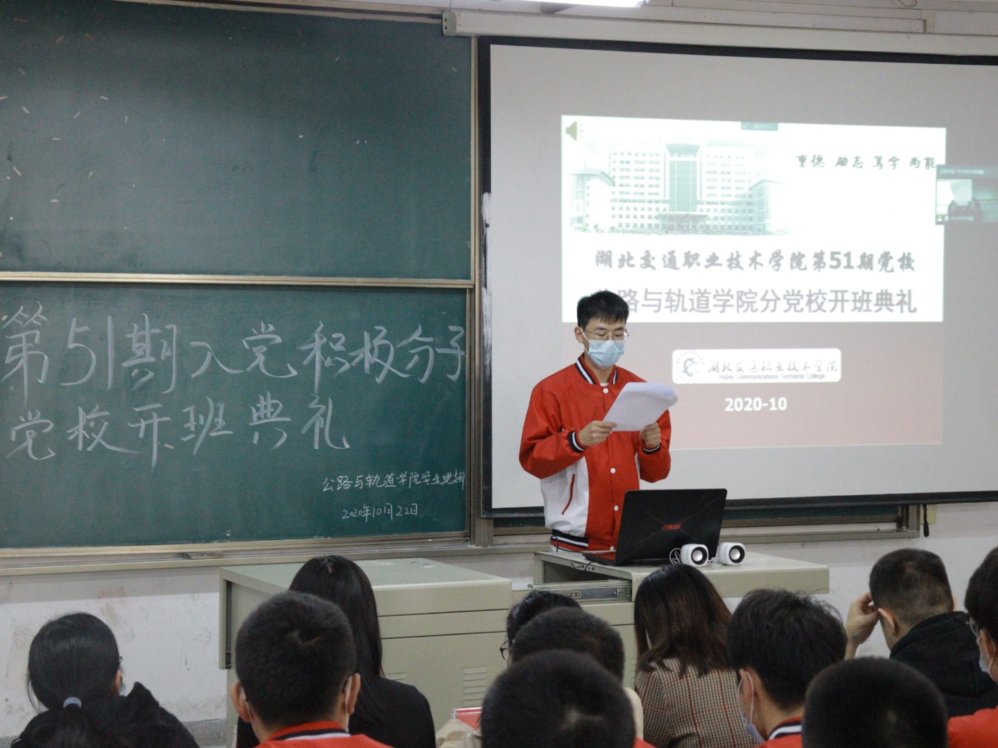 10月22日下午,公路与轨道学院第51期入党积极分子培训班以线上线下相结合的方式直播进行开班典礼。公路与轨道学院学生党支部书记沈力,学生党支部全体党员老师以及本期党校53名学员参加了此次开班典礼。