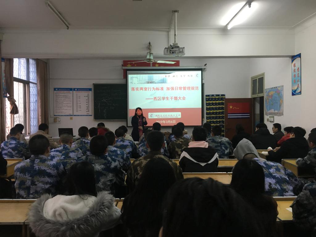 2019年是学校发展的“质量提升年”,为全面推进“三风”建设,提升学生综合素质,3月6日下午,马沧湖校区学生科组织召开了“落实两室行为标准、加强日常管理规范”学生管理人员暨学生干部大会。全体辅导员、教官,各专业学生骨干参加会议。