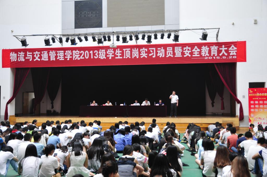 “实习是个前社会状态,摆正实习心态尤为重要,要做好实习期间吃苦的准备,不好高骛远……”5月28日下午,随着激昂慷慨的声音从学院体育馆传出,我校物流与交通管理学院2013级学生顶岗实习动员暨安全教育大会顺利进行。物流与交通管理学院院长石小平、党总支书记胡建军、全体教职工以及物交院2013级的全体同学出席了本次动员会。