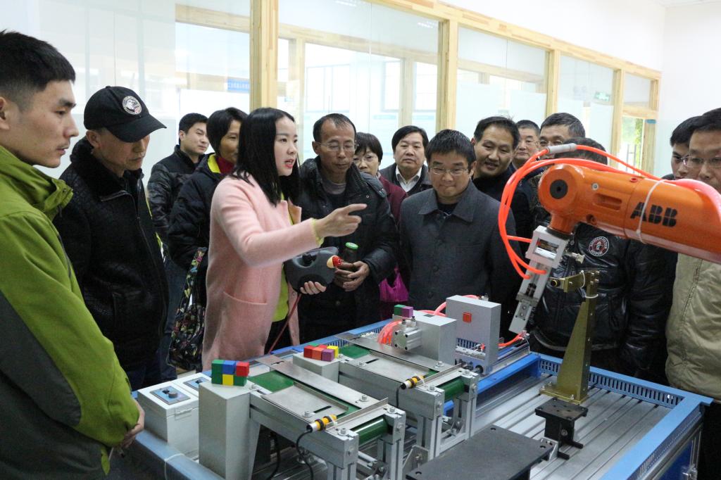 12月1日,汽车与航空学院举办工业机器人专业教学教研交流活动,该院教师杨程主讲的“工业机器人基本认识” 公开课引来众多老师观摩,学校教务处处长严石林和教学督导陈克参与活动。