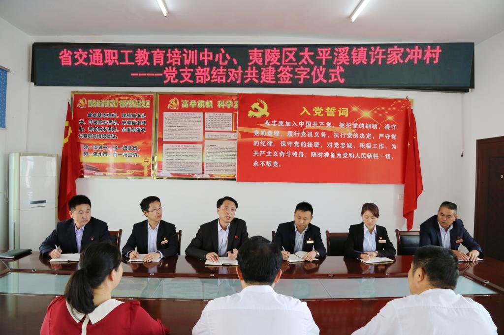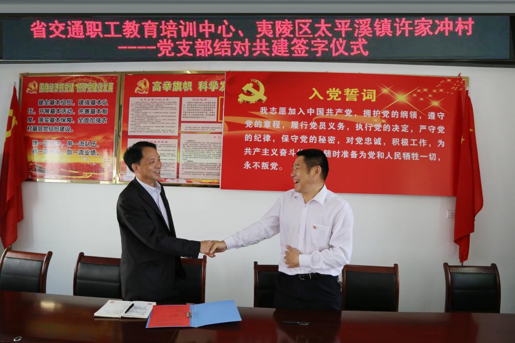 教培中心党支部与许家冲村党支部书记共同签署了结对共建协议书。会上,双方书记及党员代表就本单位在党建工作中的亮点、做法进行了交流,同时表示在今后的共建活动中,将本着“资源共享、优势互补”的原则,切实做好共建活动,共同促进单位发展,提升党建工作水平。下一步双方将围绕助力交通发展、创新党建工作和建设爱国主义教育基地等方面展开工作。