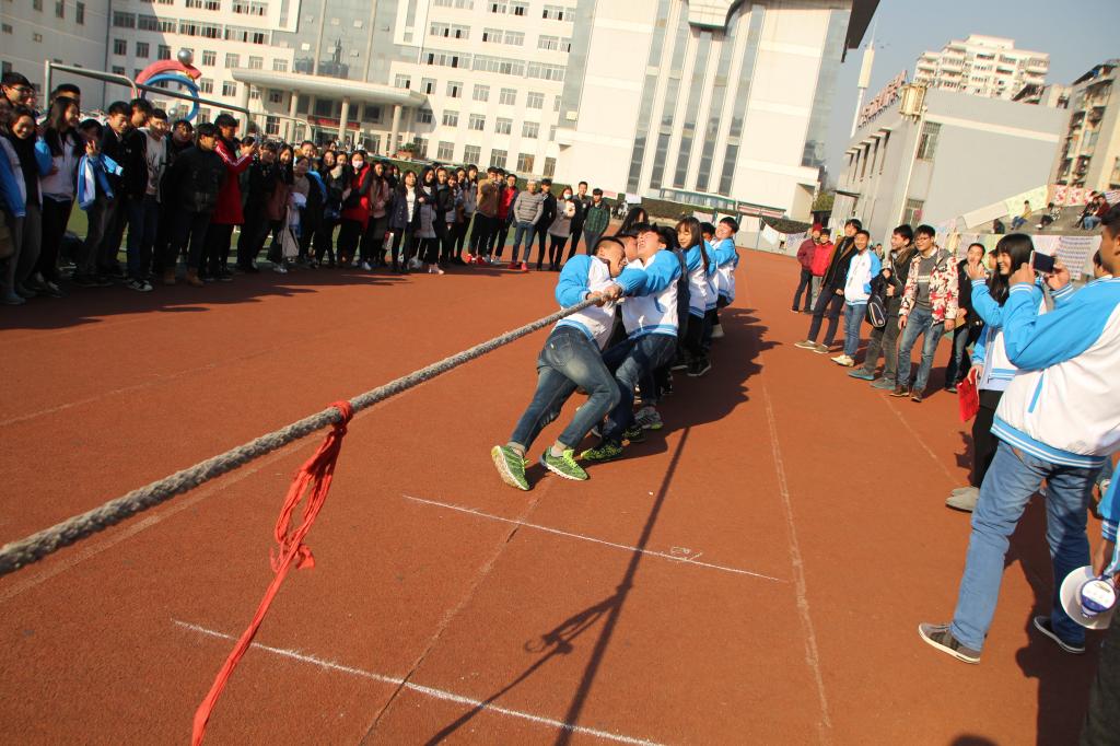 当比赛的哨声一响,双方口号震天,气势轩昂。有的同学脸憋的通红却毫不放松,有的“面部狰狞”使尽浑身解数,还有的干脆闭上眼睛卯足了劲儿往后拉。女同学也不甘示弱,一个个咬紧牙关,将巾帼不让须眉的精神风貌发扬的淋漓尽致,加油声,呐喊声,助威声直入云霄。