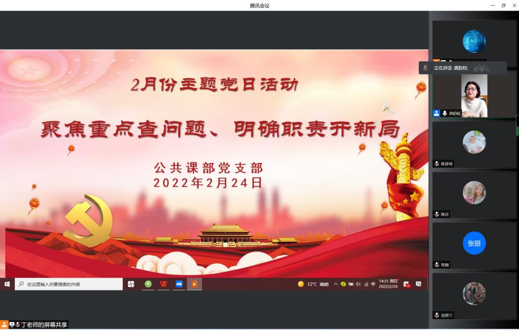 2月24日,公共课部党支部在腾讯会议开展了支部2月份主题党日活动暨2021年度支部组织生活会及民主评议党员大会,活动以“聚焦重点查问题,明确职责开新局”为主题,支部书记龚韵枝主持,支部全体党员参加,副校长王孝斌以普通党员身份参加了活动。