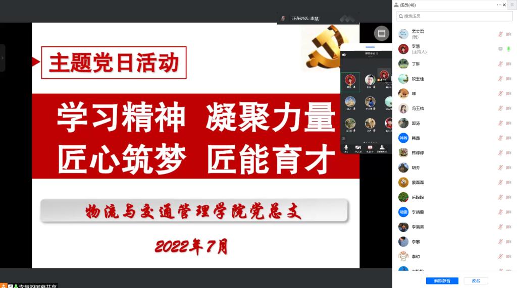 7月28日下午,物交院党总支通过线上线下的方式开展了“学习精神 凝聚力量 匠心筑梦 匠能育才”主题党日活动。物交院全体党员参加了会议。