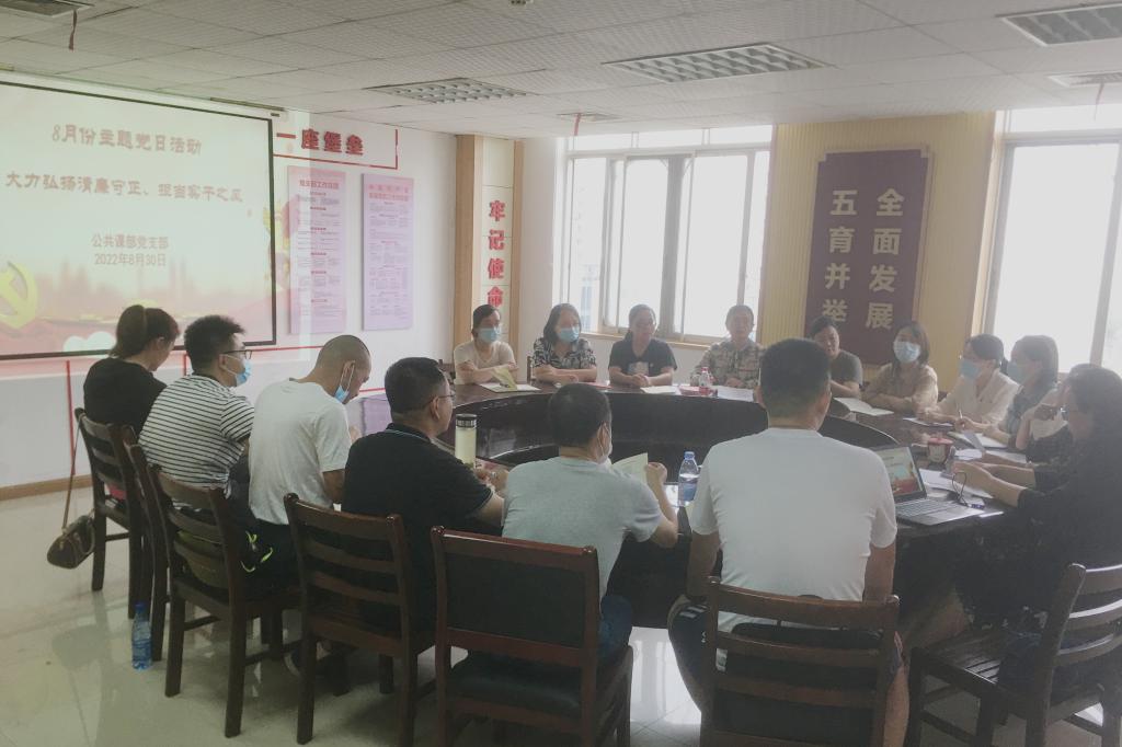 8月30日,公共课部党支部在党员活动室A1012开展了支部7月份、8月份主题党日活动。7月份活动主题为“永做建成支点的先行官,敢做走在前列的硬支撑、争做谱写新篇的先进者”,8月份活动主题为“大力弘扬清廉守正、担当实干之风”。活动由支部书记龚韵枝主持,支部全体党员参加。