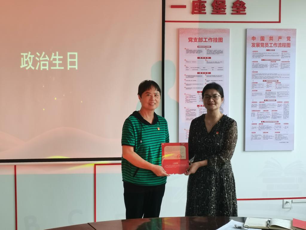 活动中颁发了政治生日卡,龚韵枝为当月过政治生日的老党员刘翠兰同志宣读了政治生日卡内容,刘翠兰同志称这是今年退休前最好的礼物,表示自己退休后依然要为支部作出贡献,为学校发展出力。