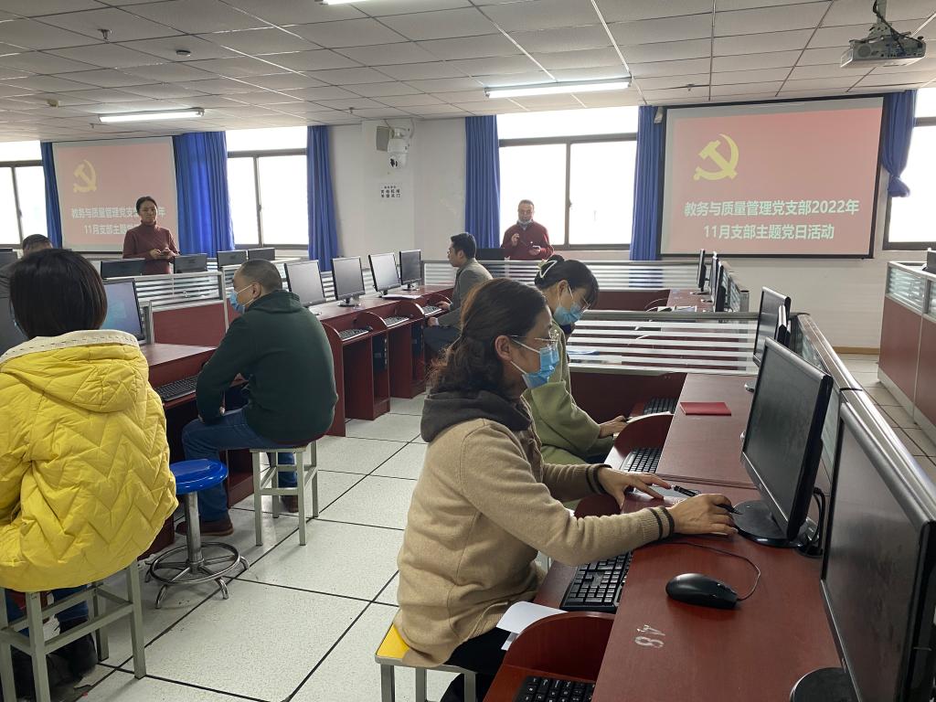 11月24日下午,教务与质量管理党支部在图书信息大楼D1007室开展了“专题学习二十大 开展专业管理系统培训 党务业务同推进”主题党日活动。活动由支部书记上官兵主持,支部全体党员参加。