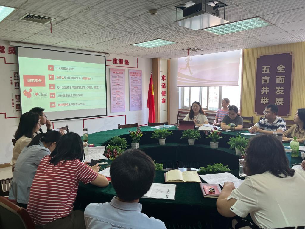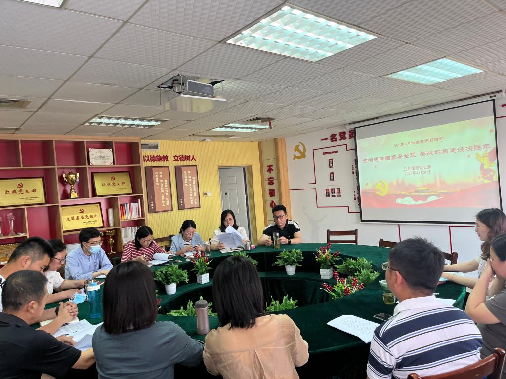 4月20日,公共课部党支部在党员活动室开展了支部4月份主题党日活动,本次活动以“贯彻总体国家安全观,奋战双高建设决胜年”为主题,支部副书记唐艳主持,支部全体党员参加。