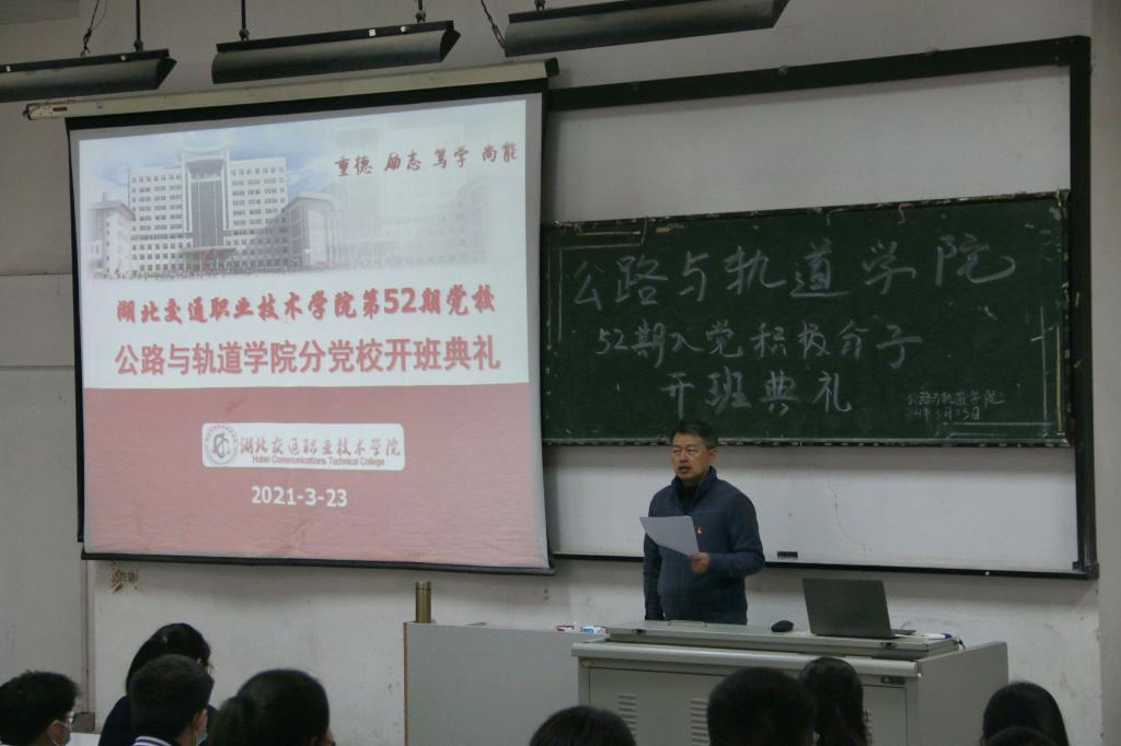3月23日,公路与轨道学院第52期入党积极分子培训班开班典礼暨第一讲——“党旗下的青春”在A213教室举行。公轨学院党总支书记程海潜、总支专职副书记朱婧、学生党支部书记魏娟、学生党支部教师及学生党员、80名本期学员,共计参加了本次开班典礼。