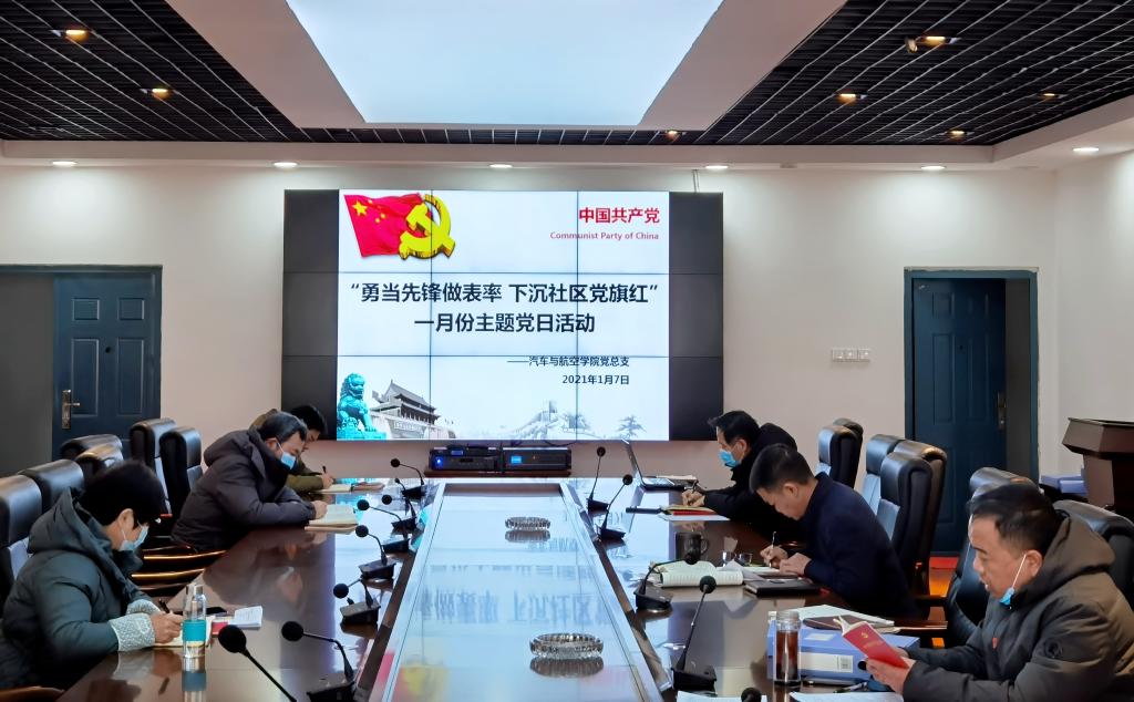 1月7日下午,汽车与航空学院党总支在协同创新中心组织全体党员开展“勇当先锋做表率·下沉社区党旗红”主题党日活动,会议由党总支专职副书记马进主持。