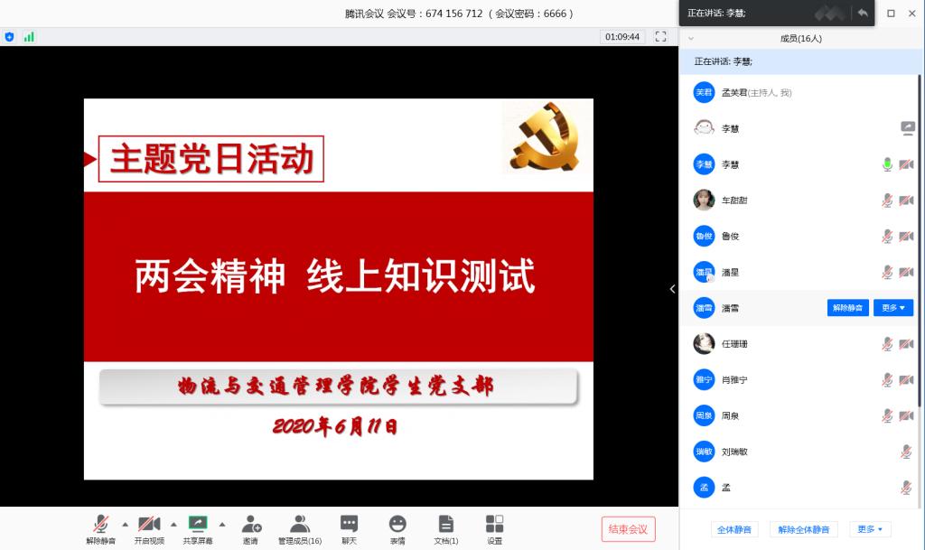 6月11日下午,物交院学生党支部在腾讯会议召开了“学‘两会’精神 聚发展力量”的主题党日活动。会议由物交院学生党支部书记李慧主持,支部全体党员参加。