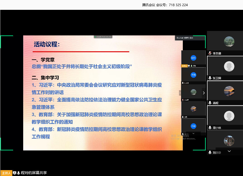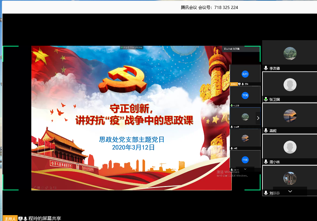 不忘初心,牢记使命,在思政课中传递抗“疫”力量。为贯彻落实习近平总书记关于新冠肺炎疫情防控工作的重要讲话和指示精神,全力支持配合打赢疫情防控阻击战,进一步增强党员在疫情面前的党性意识,落实学校党委关于防疫工作的有关要求,有条不紊推进“停教不停学、停课不停学”的工作任务,3月12日下午,思想政治教育处通过腾讯网络视频会议,开展了以“守正创新,在抗“疫”战争中讲好思政课”为主题的主题党日活动,并召开了3月份思政课教学集体研讨会,全体思政课教师在线参会。
