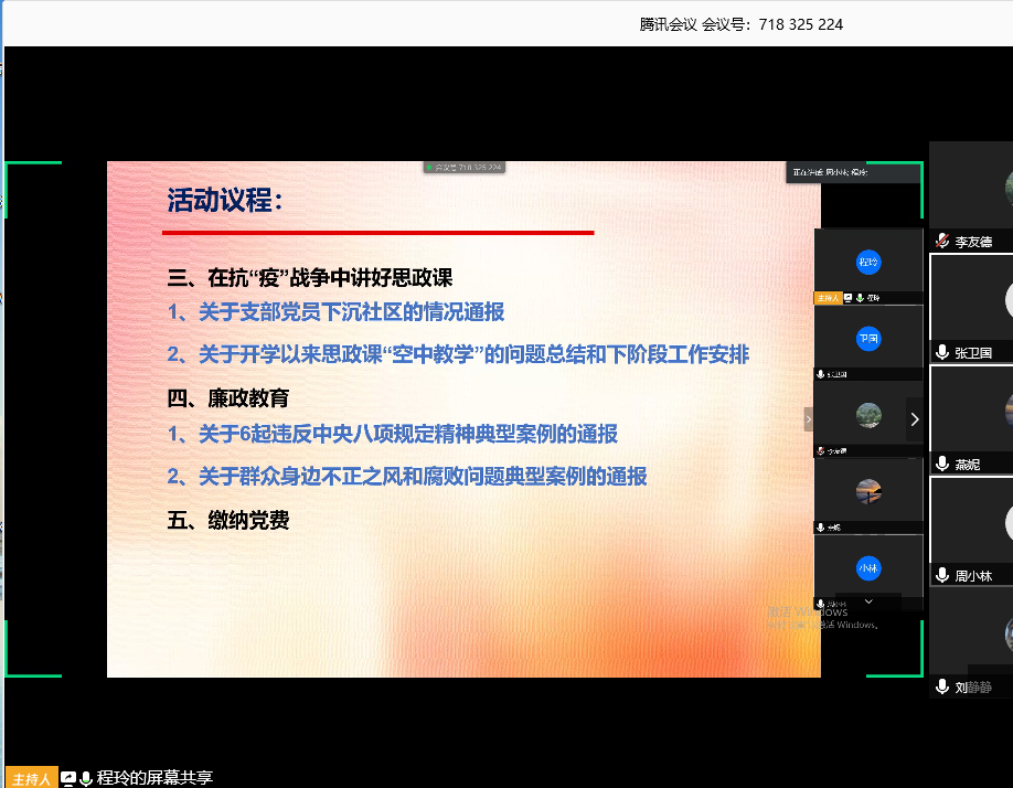 在主题党日活动中,全体党员集体学习诵读了《党章》总纲“我国处在社会主义初级阶段”部分的内容。张卫国同志结合当前全国新冠肺炎疫情的形势,领学了习近平总书记在2020年《求是》第四期和第五期发表的《在中央政治局常委会会议研究应对新型冠状病毒肺炎疫情工作时的讲话》和《全面提高依法防控依法治理能力健全国家公共卫生应急管理体系》两篇重要文章。支部书记程玲同志解读了教育部社科司印发的《关于加强新冠肺炎疫情防控期间高校思想政治理论课教学组织工作的通知》、《新冠肺炎疫情防控期间高校思想政治理论课教学组织工作规程》文件精神。张卫国、蒋燕和燕妮三位党员向党支部汇报各自下沉社区,协助社区开展疫情防控工作的具体情况和切身体会。会上通报了近期上级纪检部门通报的6起违反中央八项规定精神的典型案例和群众身边不正之风和腐败问题的典型案例,开展了廉政教育。全体党员在线缴纳了党费。