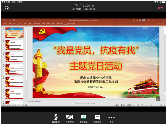 为保证党组织生活正常化,进一步加强党支部的凝聚力、战斗力,为更好开展疫情防控及网络教学、毕业生就业等各项工作打下坚实的思想基础,3月5日下午,物交院教工党支部32名教工党员在腾讯会议平台上开展了别开生面的“我是党员,抗疫有我”线上主题党日活动。纪委书记齐建模以普通党员身份参加活动。活动由党支部书记万雯主持。