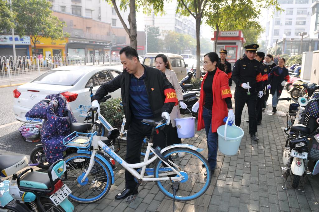 参加活动的党员同志由学校北门往华师方向出发,沿路清理摆放不规范的共享单车及电动车。大家将车一辆一辆地逐一挪移到停放点,并进行规整,按秩序整齐摆放。大家还细心地清除了共享单车、电动车上贴的小广告,认真地擦拭车上的污渍。在大家的共同努力下,整个街道焕然一新。