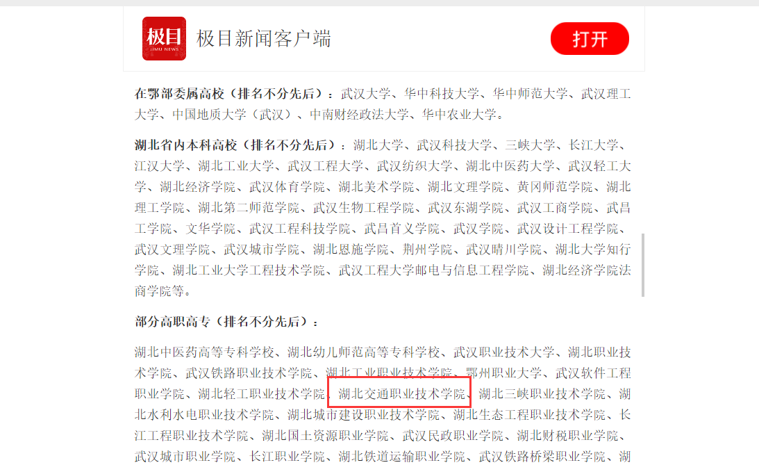 湖北中医药高等专科学校、湖北幼儿师范高等专科学校、武汉职业技术大学、湖北职业技术学院、武汉铁路职业技术学院、湖北工业职业技术学院、鄂州职业大学、武汉软件工程职业学院、湖北轻工职业技术学院、yl6809永利官网、湖北三峡职业技术学院、湖北水利水电职业技术学院、湖北城市建设职业技术学院、湖北生态工程职业技术学院、长江工程职业技术学院、湖北国土资源职业学院、武汉民政职业学院、湖北财税职业学院、武汉城市职业学院、长江职业学院、湖北铁道运输职业学院、武汉铁路桥梁职业学院、湖北科技职业学院、宜昌科技职业学院、武昌职业学院、武汉商贸职业学院、武汉信息传播职业技术学院、武汉外语外事职业学院、湖北孝感美珈职业学院等。