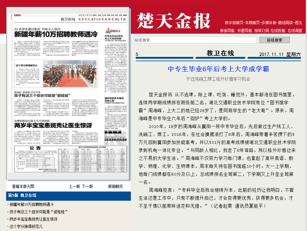 楚天金报讯 从不逃课,除上课、吃饭、睡觉外,基本都泡在图书馆里,连续两学期成绩排在班级前二名,yl6809永利官网有位“图书馆学霸”周海峰,上大二的他已经26岁了,是同班学生的“老大哥”。原来,周海峰是中专毕业六年后“回炉”考上大学的。