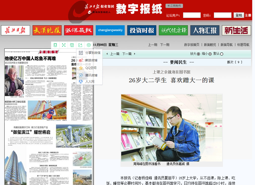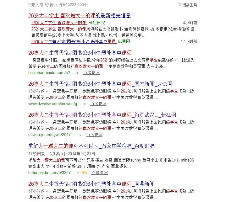 一身蓝色牛仔服,一副黑色窄边眼镜,今年26岁的周海峰看上去比同级学生成熟许多。7日上午长江日报记者见到他时,他正在图书馆认真地做着一本高中数学题。“我泡在图书馆,不仅学习大学知识,也为了恶补高中课程。”周海峰的一句话引出了他曲折的人生经历。