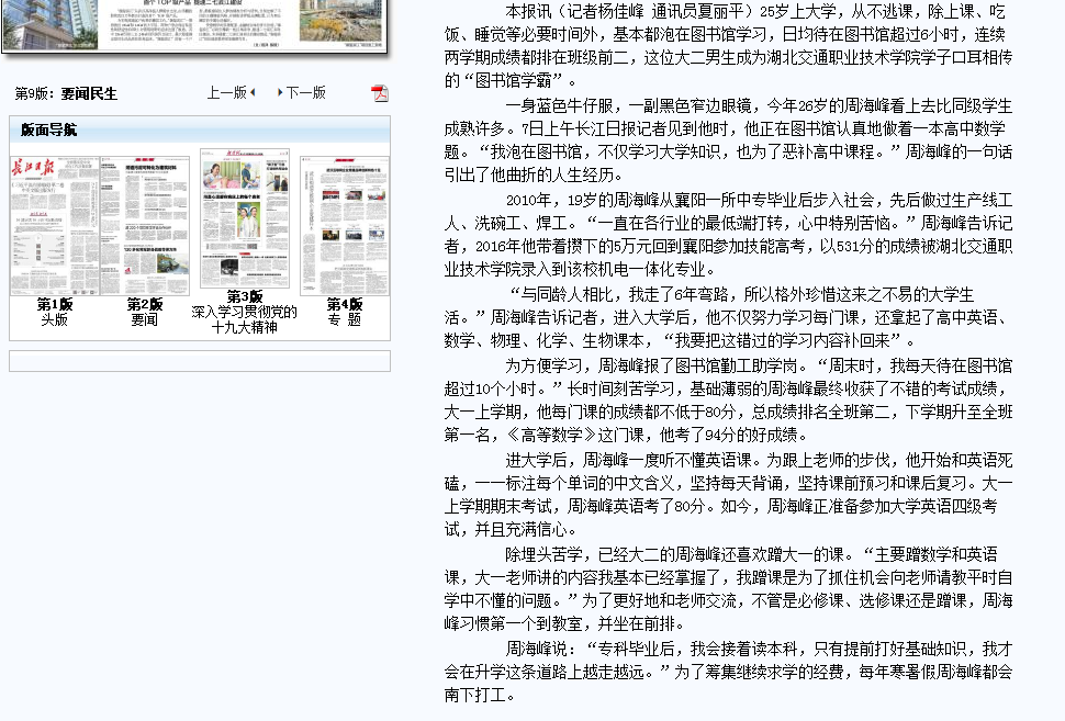 为方便学习,周海峰报了图书馆勤工助学岗。“周末时,我每天待在图书馆超过10个小时。”长时间刻苦学习,基础薄弱的周海峰最终收获了不错的考试成绩,大一上学期,他每门课的成绩都不低于80分,总成绩排名全班第二,下学期升至全班第一名,《高等数学》这门课,他考了94分的好成绩。
