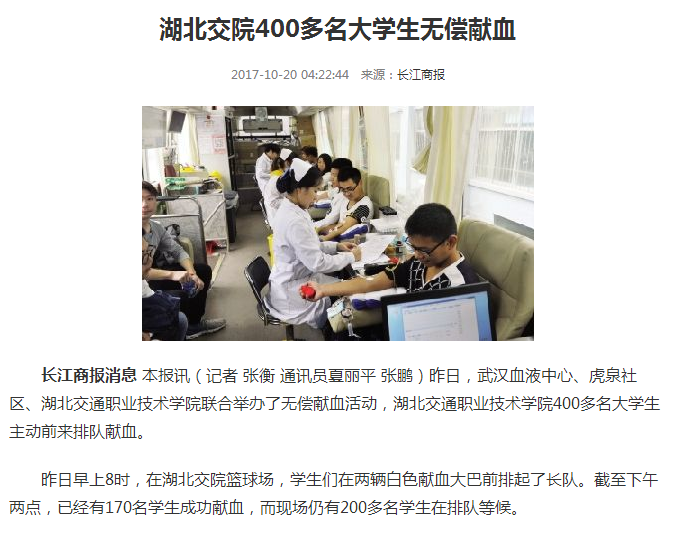 昨日早上8时,在湖北交院篮球场,学生们在两辆白色献血大巴前排起了长队。截至下午两点,已经有170名学生成功献血,而现场仍有200多名学生在排队等候。