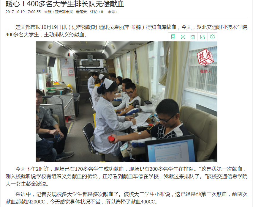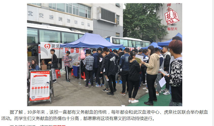 据了解,10多年来,该校一直都有义务献血的传统,每年都会和武汉血液中心、虎泉社区联合举办献血活动。而学生们义务献血的热情也十分高,都愿意将这项有意义的活动持续进行。
