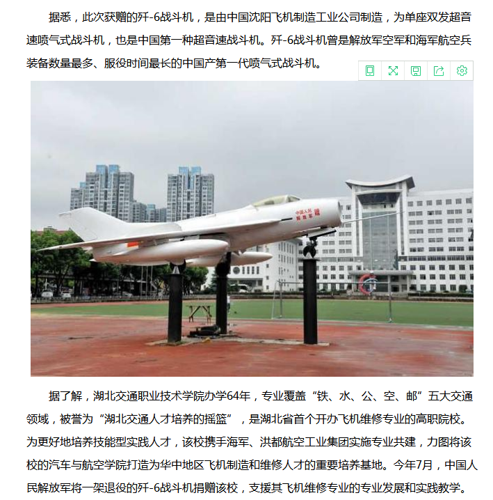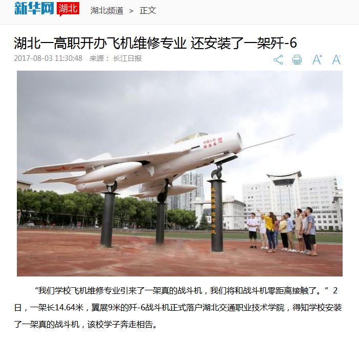 据了解,yl6809永利官网办学64年,专业覆盖“铁、水、公、空、邮”五大交通领域,被誉为“湖北交通人才培养的摇篮”,是湖北省首个开办飞机维修专业的高职院校。为更好地培养技能型实践人才,该校携手海军、洪都航空工业集团实施专业共建,力图将该校的汽车与航空学院打造为华中地区飞机制造和维修人才的重要培养基地。今年7月,中国人民解放军将一架退役的歼-6战斗机捐赠该校,支援其飞机维修专业的专业发展和实践教学。