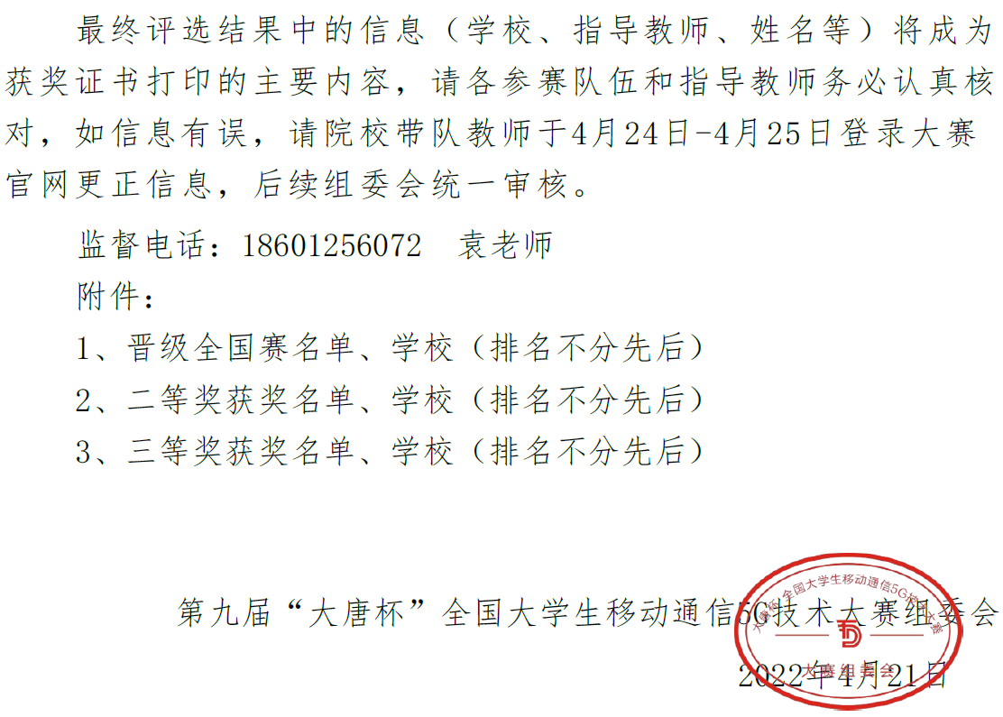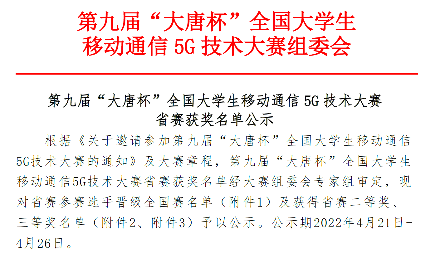 近日,第九届“大唐杯”全国大学生移动通信5G技术大赛省赛圆满落幕。我校参赛学生分别获1个省级一等奖,2个省级三等奖,获得一等奖的选手将代表我校参加全国总决赛。